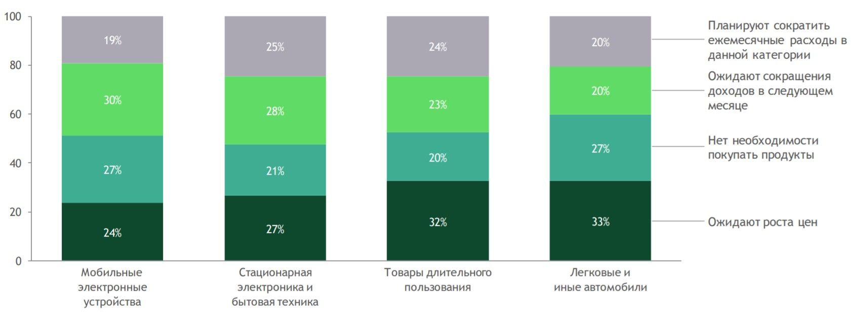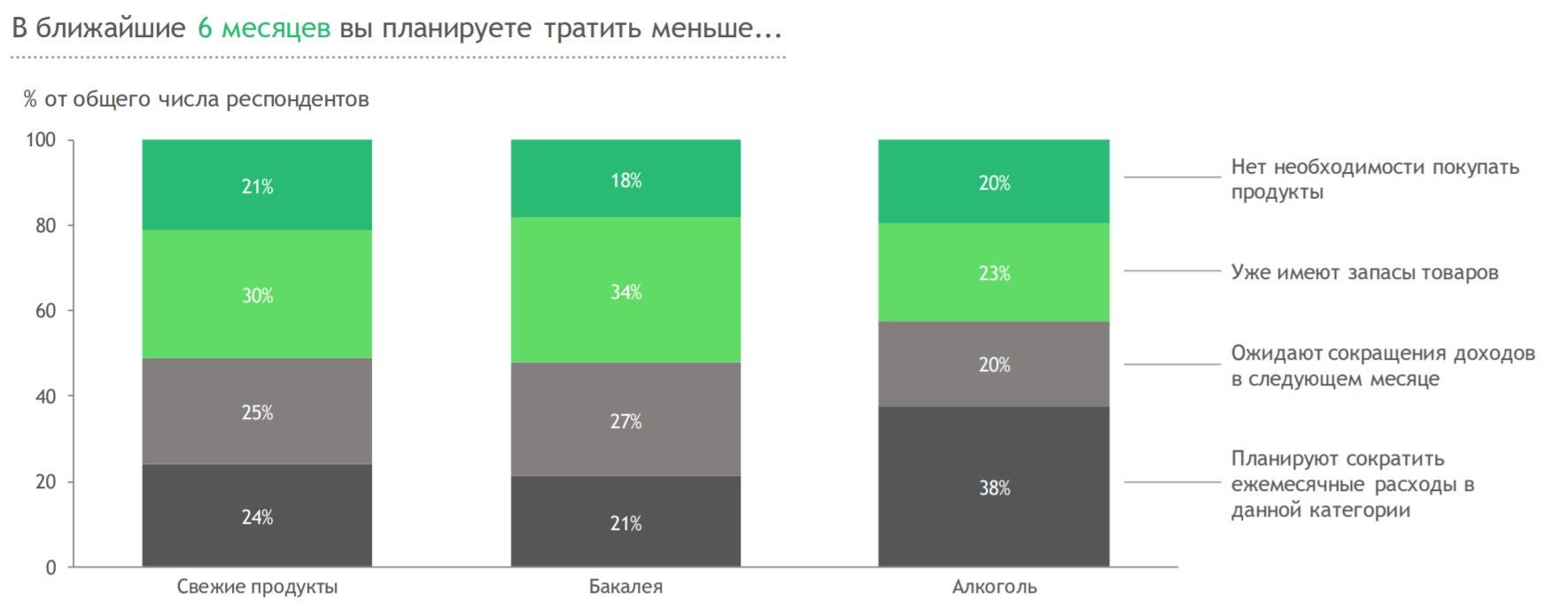 Последние исследования компании BCG и “Ромир” доказывают, что практически все жители страны собираются существенно сократить свои траты в ближайшие несколько месяцев. Экономить россияне будут на всем, включая продукты питания. Как признались сами респонденты, они готовы тратить деньги только на свежие продукты: овощи, фрукты, мясо и рыбу, а также закупать продукты «на черный день». К примеру, в стране резко возрос спрос на гречку, макароны и крупы. Таким образом, россияне стараются пополнить запасы еды, опасаясь дефицита.