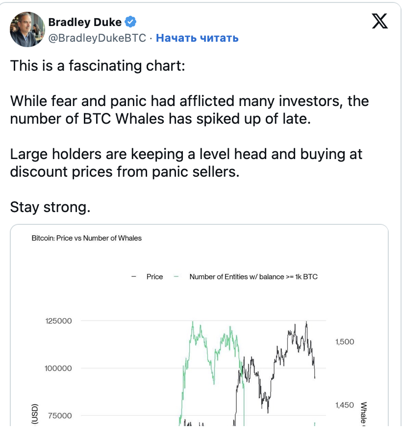 Индекс страха и жадности упал до 10 пунктов. Подобные показатели паники фиксировались инвесторами лишь в начале и середине 2022 года. К четвергу капитализация рынка сократилась более чем на $700 млрд за месяц. Несмотря на тревожные технические сигналы, макроэкономические факторы и активность крупных игроков удерживают экспертов от однозначно негативных прогнозов.