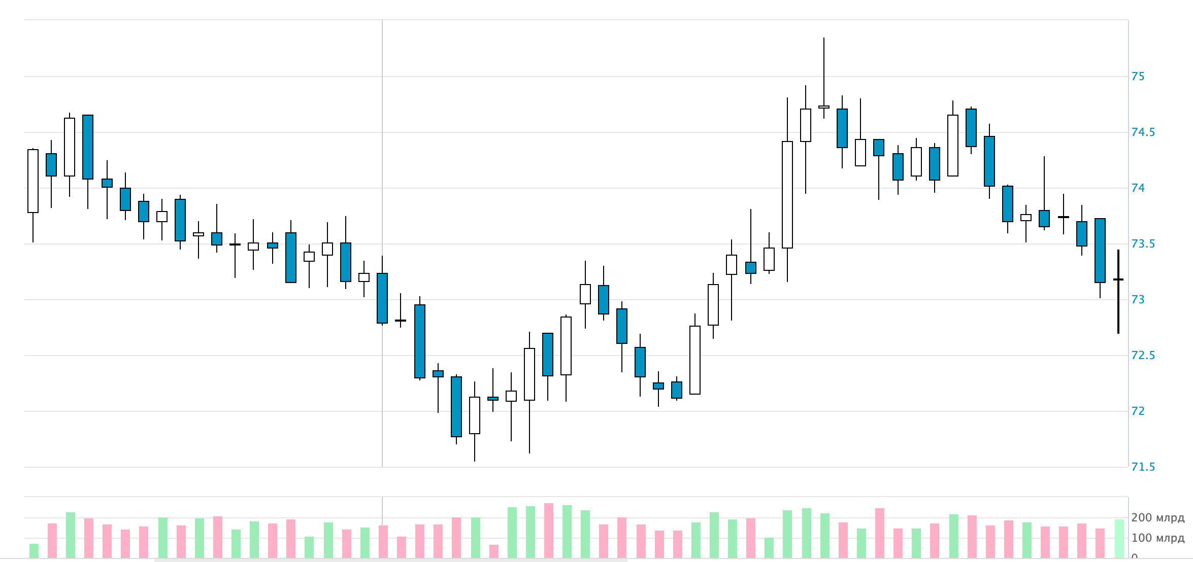Курс рубля укреплялся по отношению к доллару всю неделю и в пятницу протестировал отметку 72.72. USD/RUB спустился под отметку 73.00 впервые с конца июня. По данным Мосбиржи, рубль закончил торговую неделю на уровне 73.18 и за пять дней подорожал на 60 копеек.