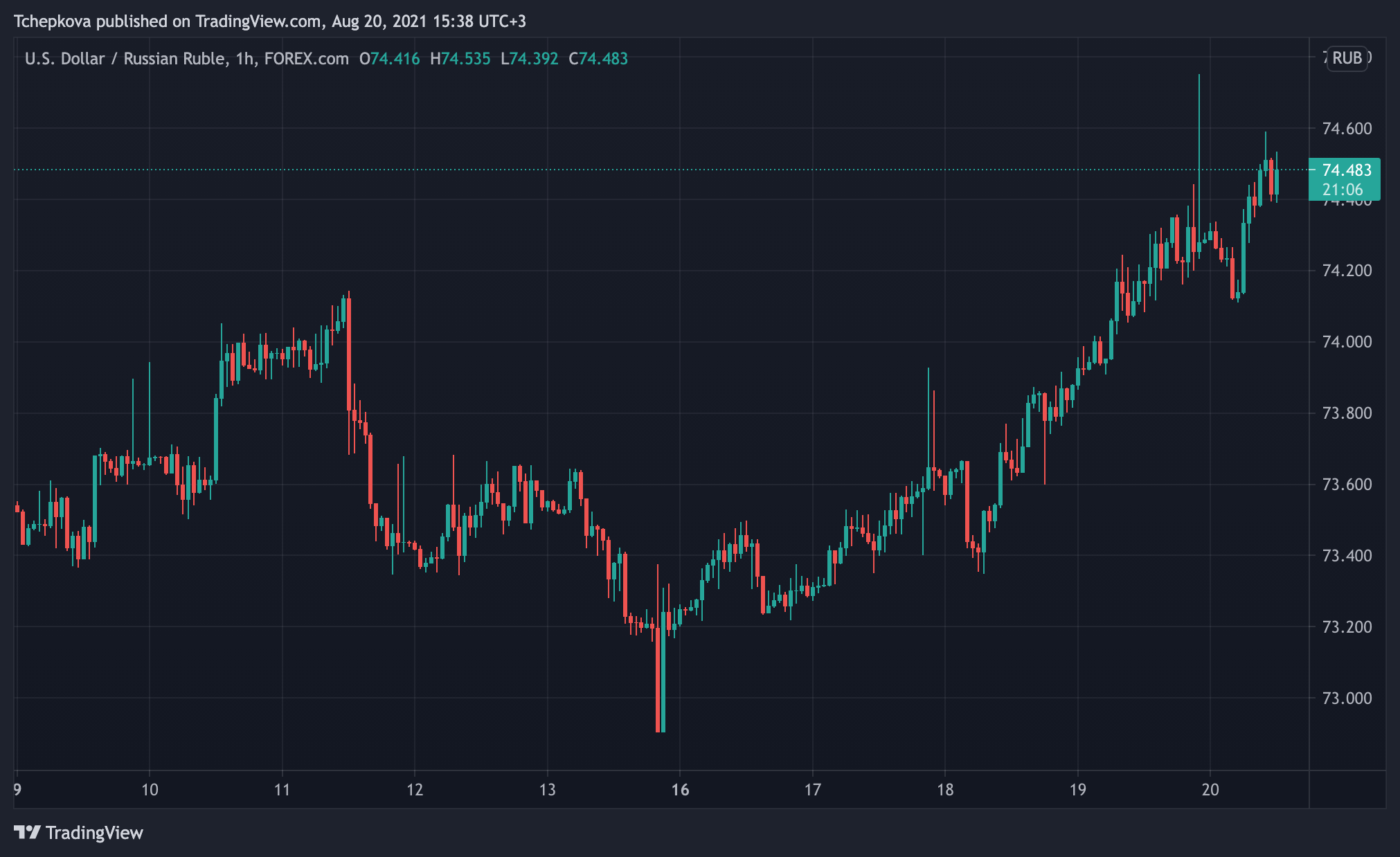 За минувшую неделю российская валюта подешевела почти на два рубля. На момент публикации USD/RUB торгуется на уровне 74.5 по сравнению с уровнем открытия в понедельник утром в районе 72.9.