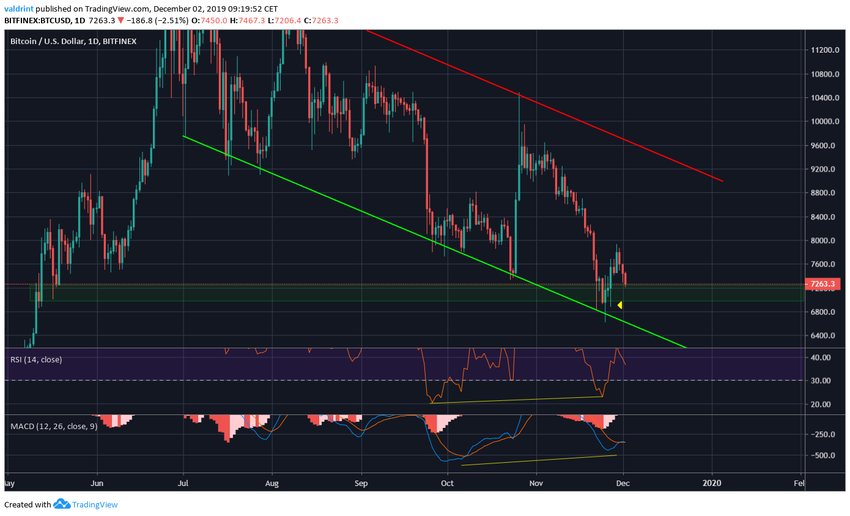 На дневном графике биткоин остается в русле нисходящего канала с конца июня. Очень сильная поддержка проходит на $7000, что подтверждает длинная свечная тень от 27 ноября.
