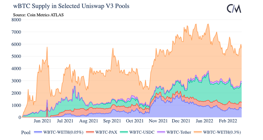 SponsoredНа децентрализованные биржи также приходится большая доля предложения wBTC. Так, торговая площадка Uniswap v3 стала крупнейшим держателем wBTC. Здесь больше всего токенизированных токенов используются для торговых пар. В общей сложности в пулах Uniswap V3 хранится около 6000 wBTC.