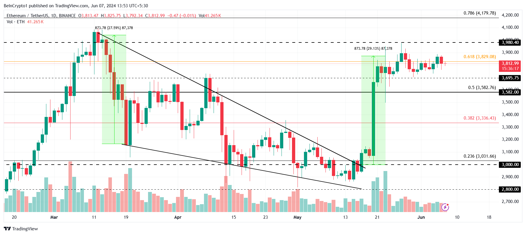 Цене ETH не удается закрепиться выше уровня Фибоначчи 61,8% коррекции на $3 829. Этот уровень также известен как основание бычьего рынка, и его восстановление нацелит монету на $4 000.
