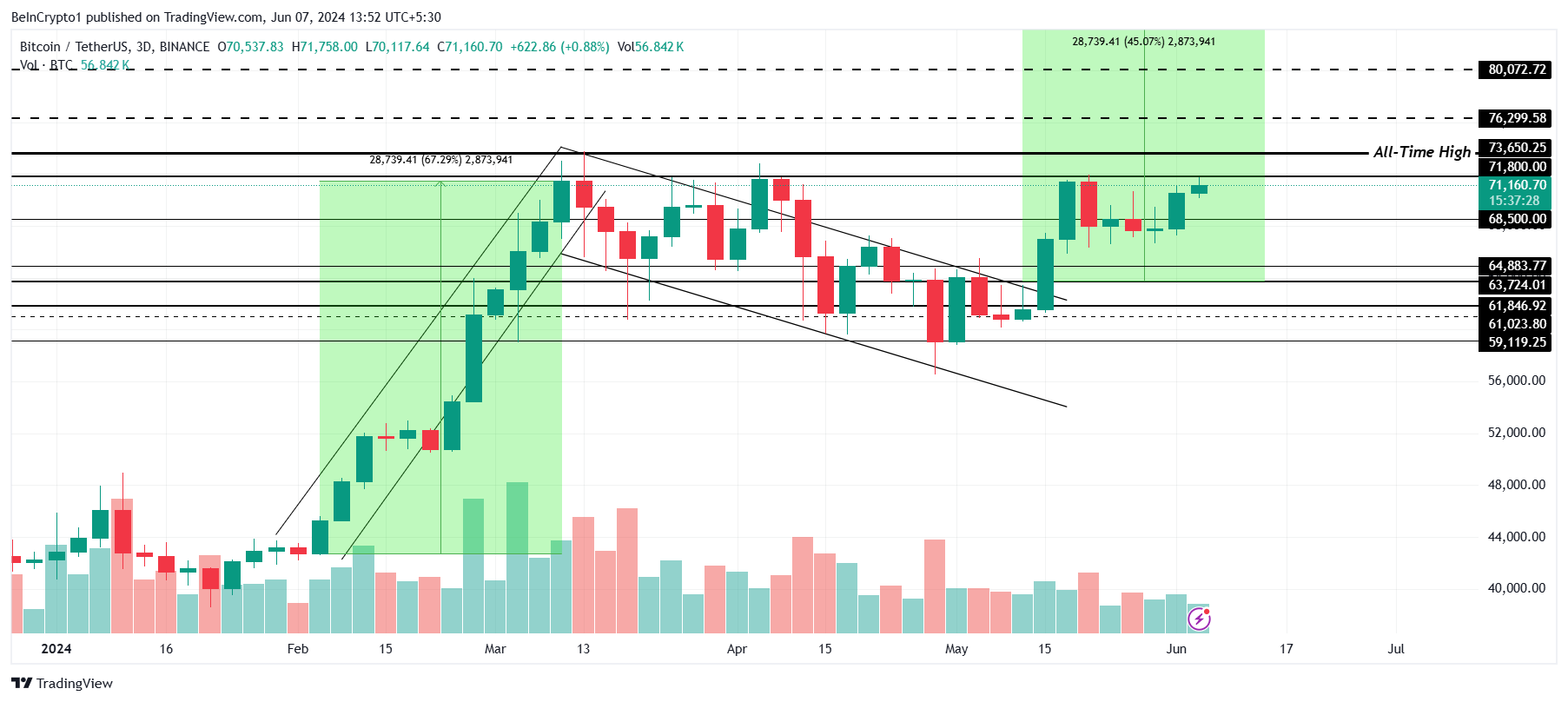 Однако более реалистичный прогноз — это достижение текущего исторического максимума (ATH) $73 650. Его преодоление ознаменует новый ATH для BTC.