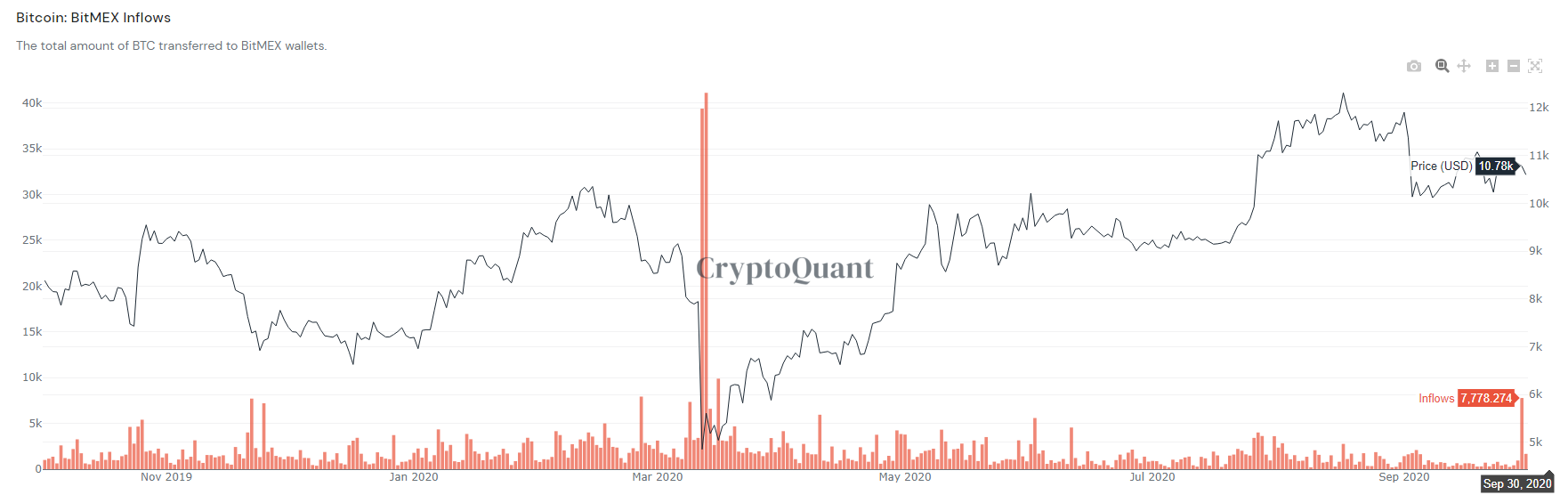 Согласно данным по транзакциям на биржевые кошельки, 30 сентября на биржу внесли почти 8 тыс. BTC (почти $84 млн), что составляет полугодовой пик по депозитам. Последний раз подобная активность наблюдалась в марте 2020 года, когда обвалились традиционные и криптовалютные рынки.