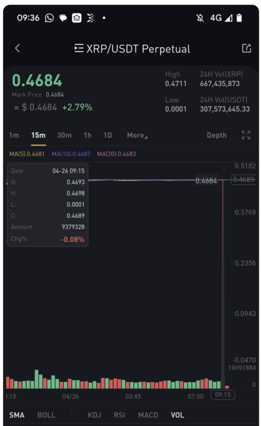 В среду, 26 апреля, нативный токен блокчейн-стартапа Ripple – XRP – на короткое время упал до $0. Это произошло на сингапурской бирже Bitrue в паре XRP/USDT. На других платформах в этот период курс XRP не опускался ниже $0,46.
