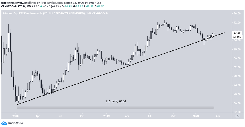 В более долгосрочной перспективе уровень доминирования следует за восходящей линией поддержки на протяжении последних 805 дней. В феврале индикатор в моменте опустился ниже этой линии, но недавно восстановился и подтвердил его актуальность.
