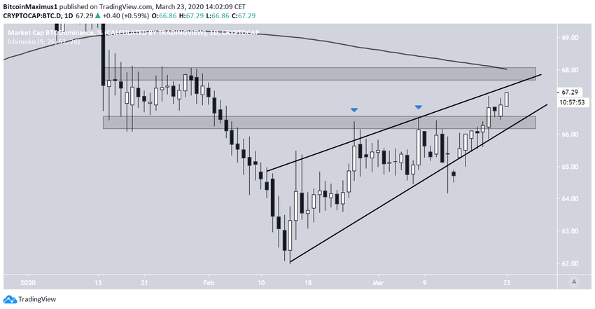 Уровень доминирования BTC находится внутри фигуры восходящий клин с середины февраля. На данном этапе следует обратить внимание на два важных фактора.