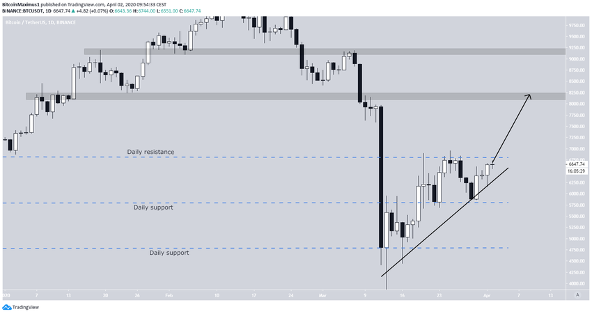 На более долгосрочных графиках видно, что криптовалюта следует за восходящей линией поддержки с момента достижения дна 13 марта. 30 марта цена подтвердила ее статус в четвертый раз и сформировала бычью свечную модель поглощения.