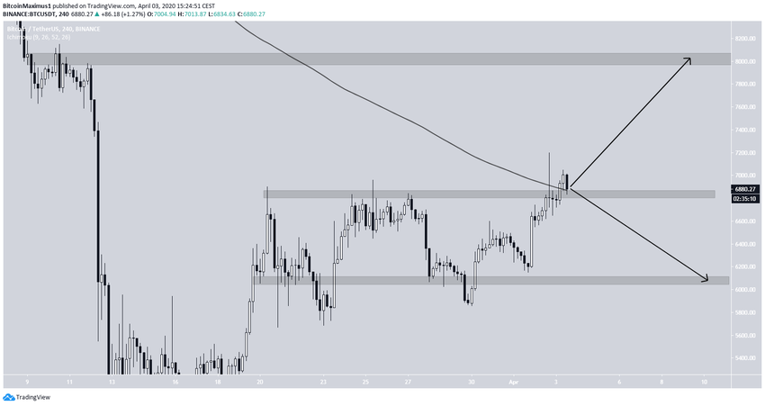 При условии закрытия над MAцена может вырасти до $8000. В противном случае ожидается движение к поддержке $6000.