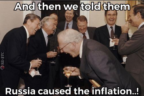Еще одной из тем для обсуждения стали заявления американских политиков о том, что инфляция в США бьет рекорды из-за действий России на геополитической арене. Подобные высказывания представителей регуляторов также стали поводом для рождения шуток.