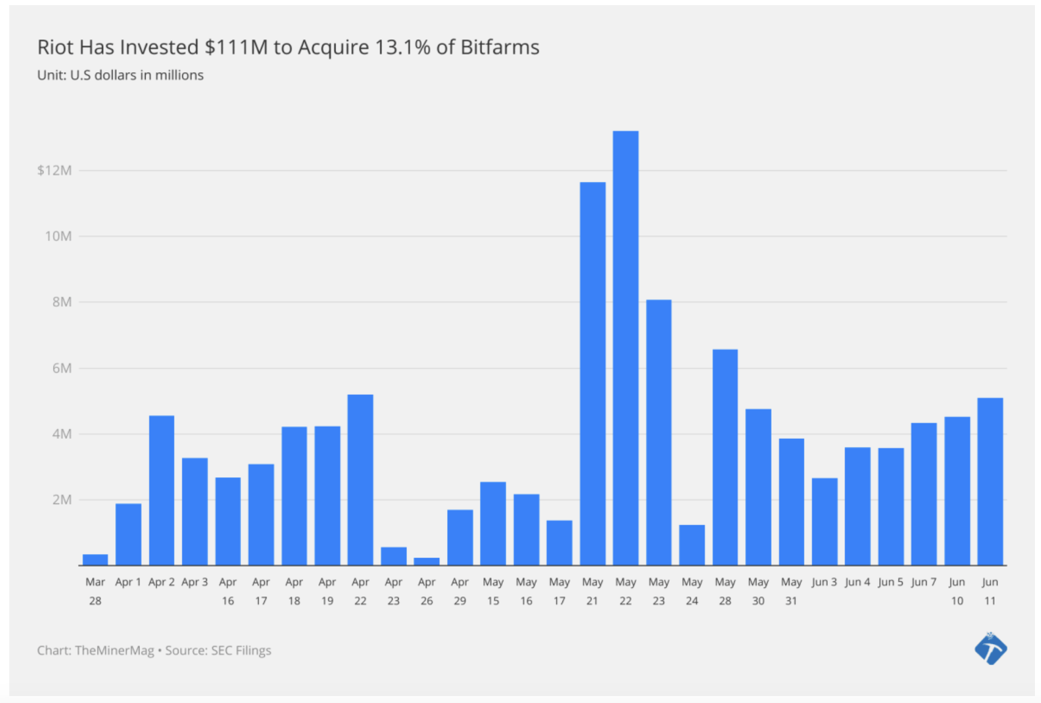 Майнер Riot приобрел на открытом рынке дополнительные 6 млн акций Bitfarms, увеличив долю в компании до 13,1%.