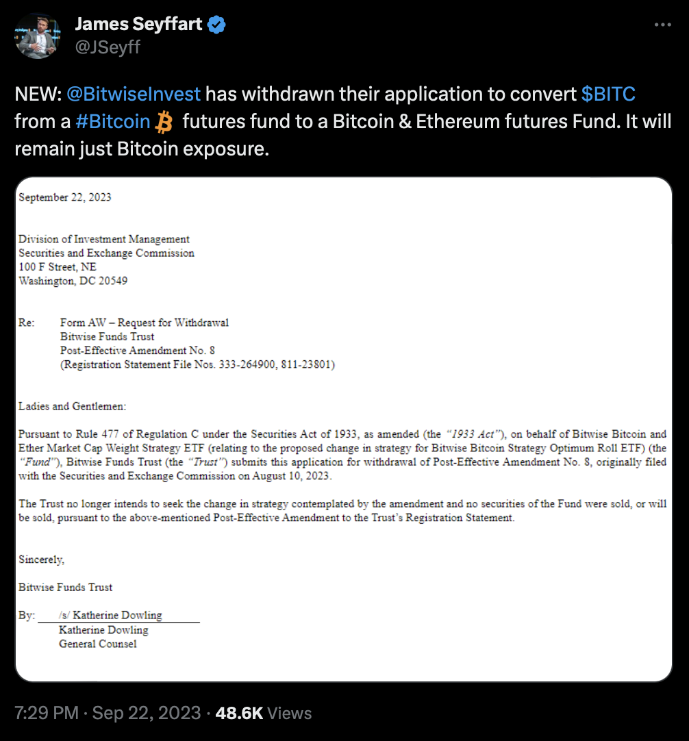 Компания Bitwise отозвала заявку на преобразование существующего фьючерсного биткоин-ETF Bitwise Bitcoin Strategy Optimum Roll ETF в фонд, инвестирующий во фьючерсные контракты на BTC и Ethereum.