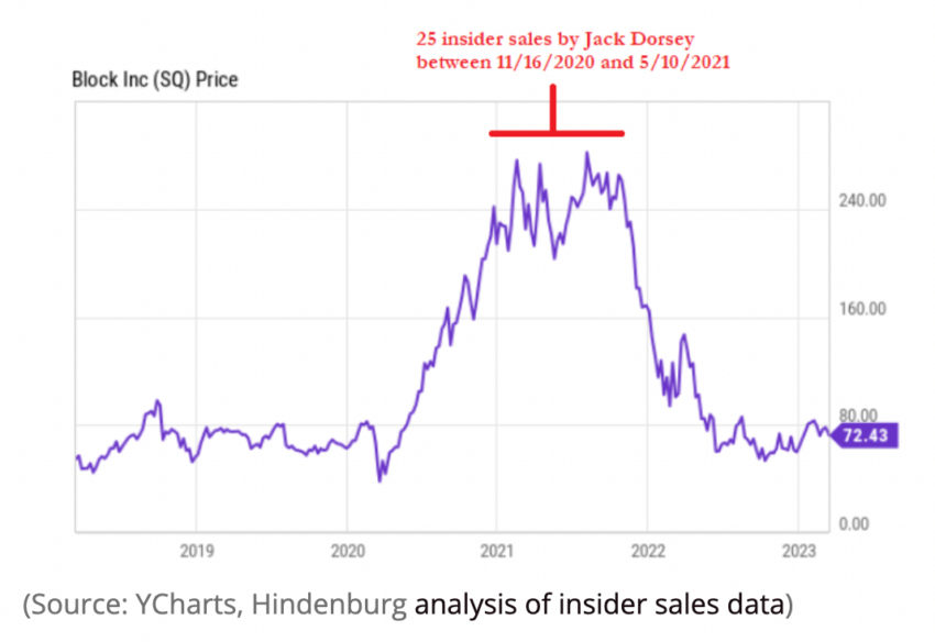 Они также заявили, что инсайдеры, включая генерального директора Джека Дорси, продали акции на сумму более $1 млрд в начале 2021 года по самой высокой цене.