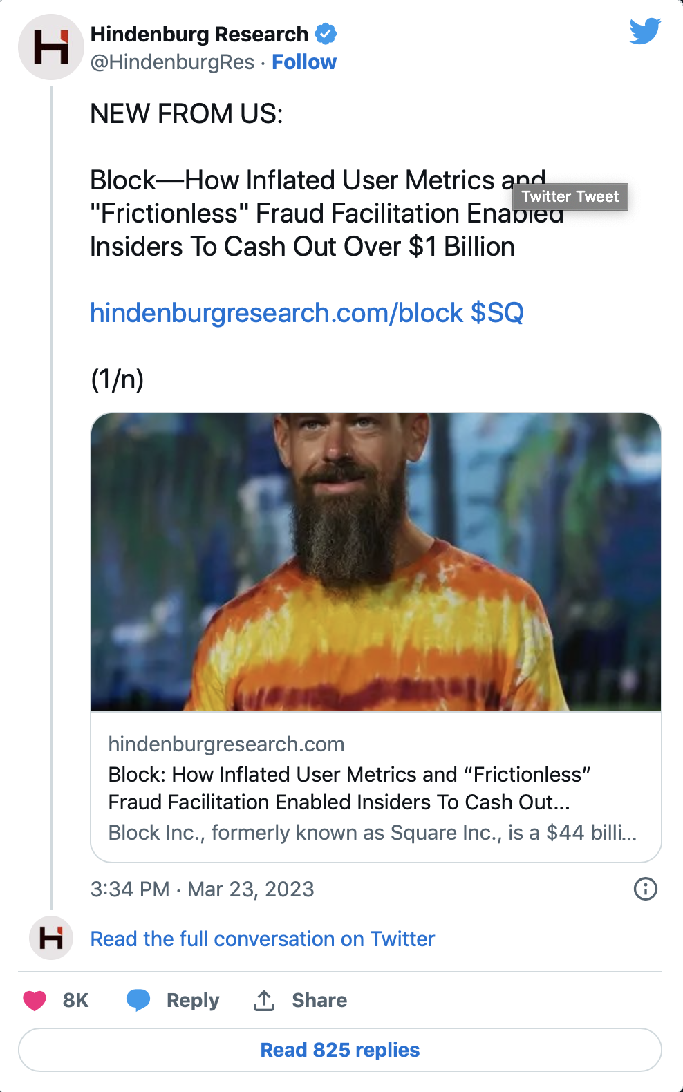 В аналитической компании Hindenburg изучили деятельность провайдера платежных услуг Block Inc. в течение последних двух лет. В эксперты утверждают, что фирма завышала данные о числе пользователей, а инсайдеры продавали акции по самой высокой цене.