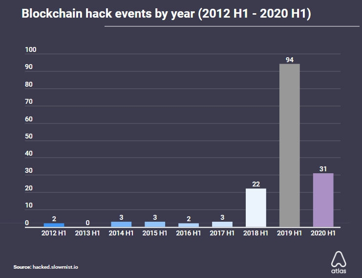 Согласно отчету, 2019 год стал рекордным для хакеров блокчейнов, где только за первое полугодие хакеры провели 94 успешных атаки. Суммарно за 2019 год злоумышленники провели более 130 успешных атак. Впрочем, как утверждают специалисты Atlas VPN, в блокчейн-индустрии замечено снижение общих атак на децентрализованные сети.