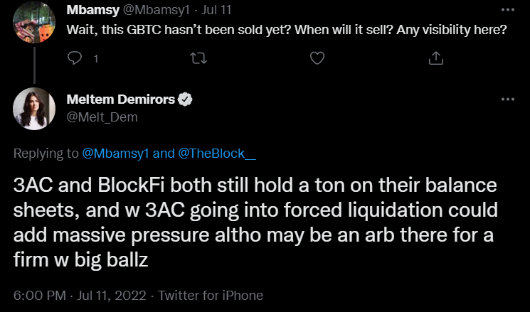 Что именно стало причиной разрыва связей BlockFi с Grayscale, неясно. Ранее глава по стратегии CoinShares Мелтем Демирорс написала у себя в Твиттере, что котировки GBTC, вероятно, упадут в ближайшее время по мере ликвидации фонда Three Arrows Capital. При этом Демирор отметила, что BlockFi (на момент написания твита) держал «тонну» акций GBTC.