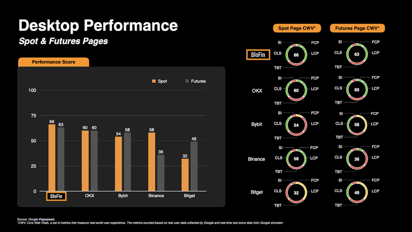 BloFin превосходит ведущие биржи по показателям загрузки страницы, спотовой и фьючерсной торговли. По данным Google PageSpeed, главная страница BloFin получила оценку 86, обойдя OKX (79), Binance (71), Bitget (60) и Bybit (54). Это показатель гарантирует быструю загрузку, плавное взаимодействие и более комфортный пользовательский опыт.