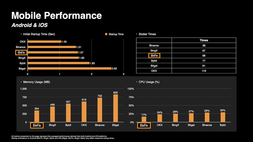 Кроме того, BloFin демонстрирует ведущую в отрасли эффективность использования памяти, используя всего 354 МБ по сравнению с Binance (732 МБ) и Bitget (832 МБ), и достигает самого низкого использования ЦП — всего 17%, что минимизирует нагрузку на устройство и увеличивает время работы батареи во время торговли.