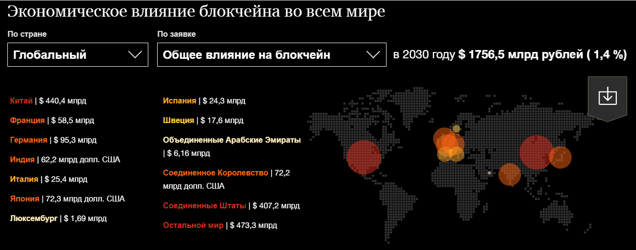 Последние исследования аналитической компании PwC “Время доверять»: причина в триллион долларов для переосмысления блокчейна” показывают, как блокчейн может повлиять на мировую экономику уже в ближайшее время. На основе анализа пяти основных сфер применений блокчейна, ранжированных по их потенциалу для создания экономической ценности: от здравоохранения, государственных и общественных услуг до производства, финансов, логистики и розничной торговли, аналитики прогнозируют потенциальную финансовую выгоду, которая может составить $1,76 трлн уже к 2030 году.