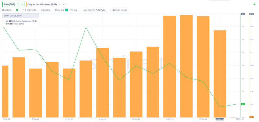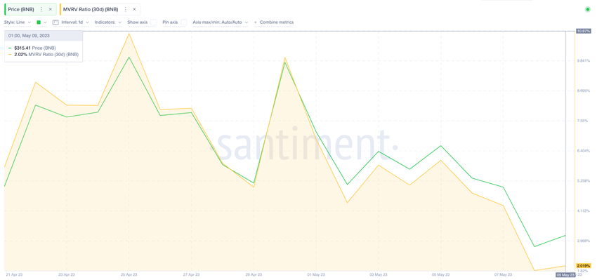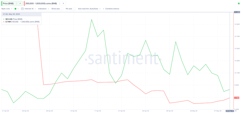 Кроме того, крупные инвесторы в BNB, являющиеся владельцами от 100 тыс. до 1 млн BNB, недавно прекратили продавать монеты после фиксации прибыли в апреле. Согласно Santiment, с 3 по 9 мая киты увеличили размер своих совокупных резервов BNB на 90 тыс. монет (порядка $28 млн по текущему курсу).