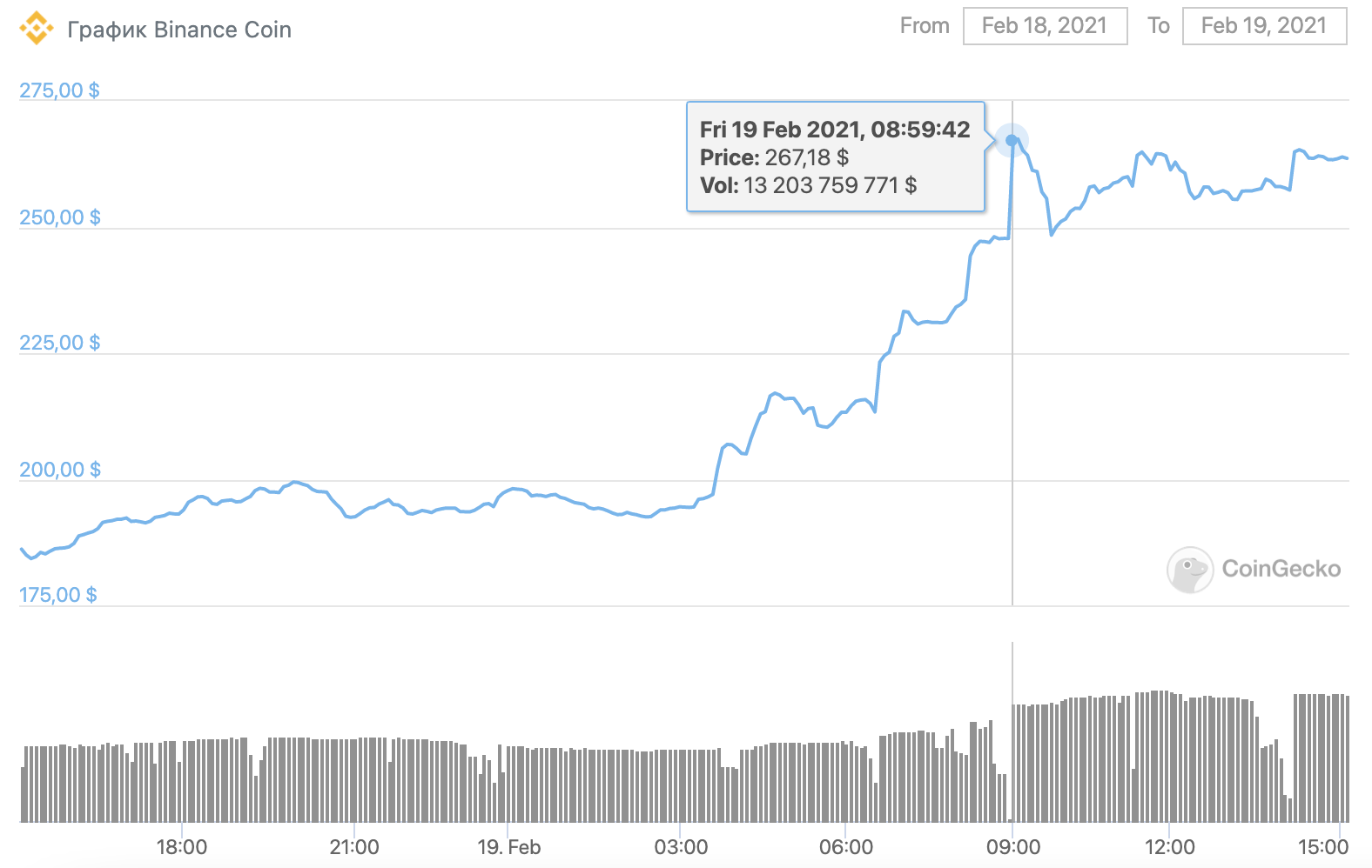 Новые программы стейкинга и фарминга подбросили BNB к рекордным уровням: 19 февраля монета достигла отметки $267 и прочно обосновалась на третьей строчке в рейтинге капитализации. На момент написания статьи BNB торгуется на уровне $263.