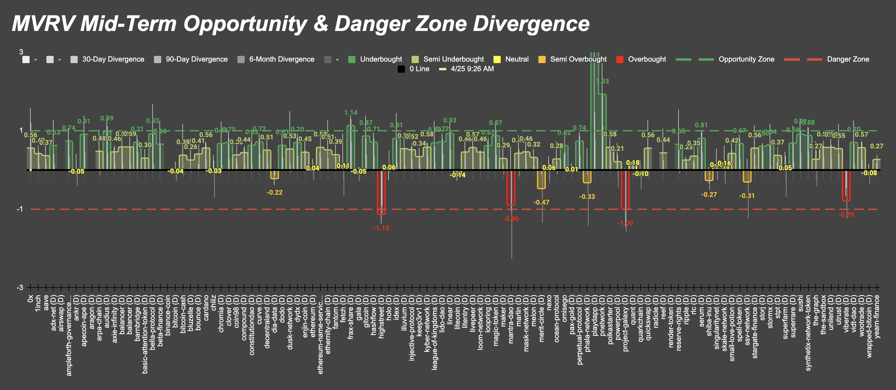 По данным Santiment, в «исторической зоне возможностей» на данный момент находятся более 85% альткоинов. Эта оценка основана на коэффициентах MVRV, рассчитанных на основе коллективной доходности кошельков за различные временные периоды.