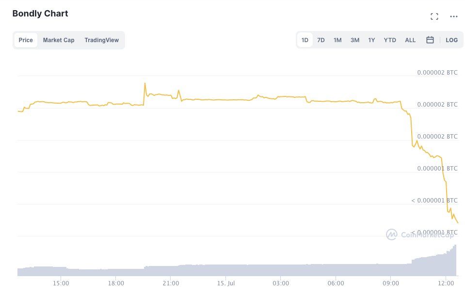 Нативный токен маркетплейса невзаимозаменяемых токенов (NFT) Bondly Finance (BONDLY) обрушился более чем на 67% из-за новостей о взломе проекта. Как заявили разработчики Bondly Finance, неизвестные осуществили атаку на протокол проекта. Детали атаки разработчики не раскрывают. Также разработчики призвали не торговать токеном BONDLY на время расследования инцидента.