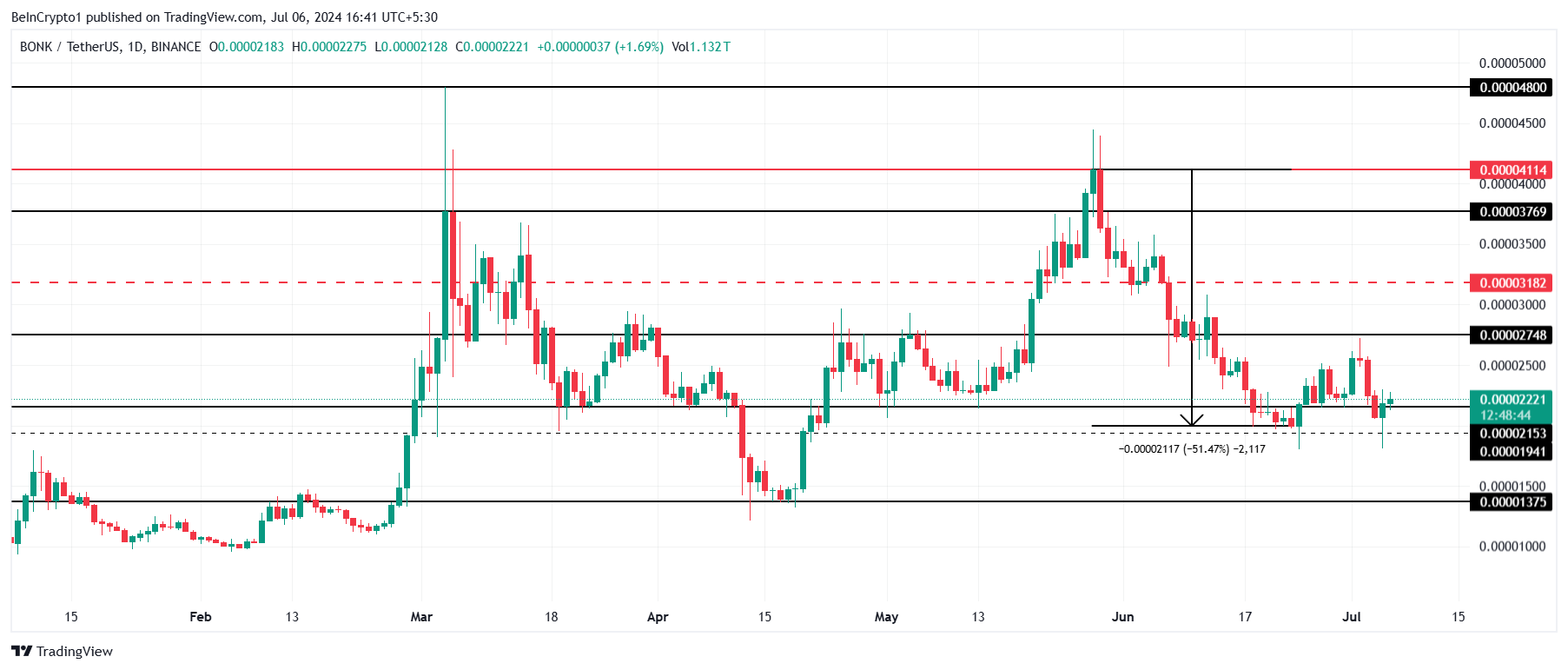 На момент написания BONK торгуется у отметки $0,00002221, удерживаясь немного выше критической поддержки в $0,00002153. Однако вышеупомянутые сигналы намекают на возможное снижение: если этот уровень не устоит, мемкоин ждет падение до $0,00001375, которое значительно увеличит убытки.