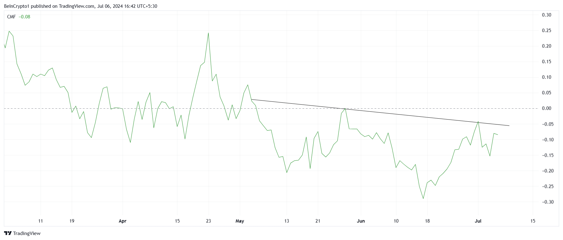 Эта ончейн-метрика измеряет движение денежных потоков, поступающих в актив и выходящих из него. Ее снижение говорит о том, что все больше держателей избавляются от мемкоина и предпочитают фиксировать убытки вместо того, чтобы ждать восстановления и начала нового восходящего тренда.