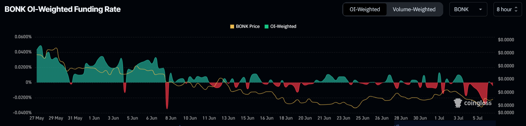 Ставка финансирования мемкоина также указывает на рост медвежьих настроений. По данным аналитической платформы Coinglass, фандинг BONK опустился ниже ноля. Это означает, что на рынке деривативов доминируют короткие позиции.