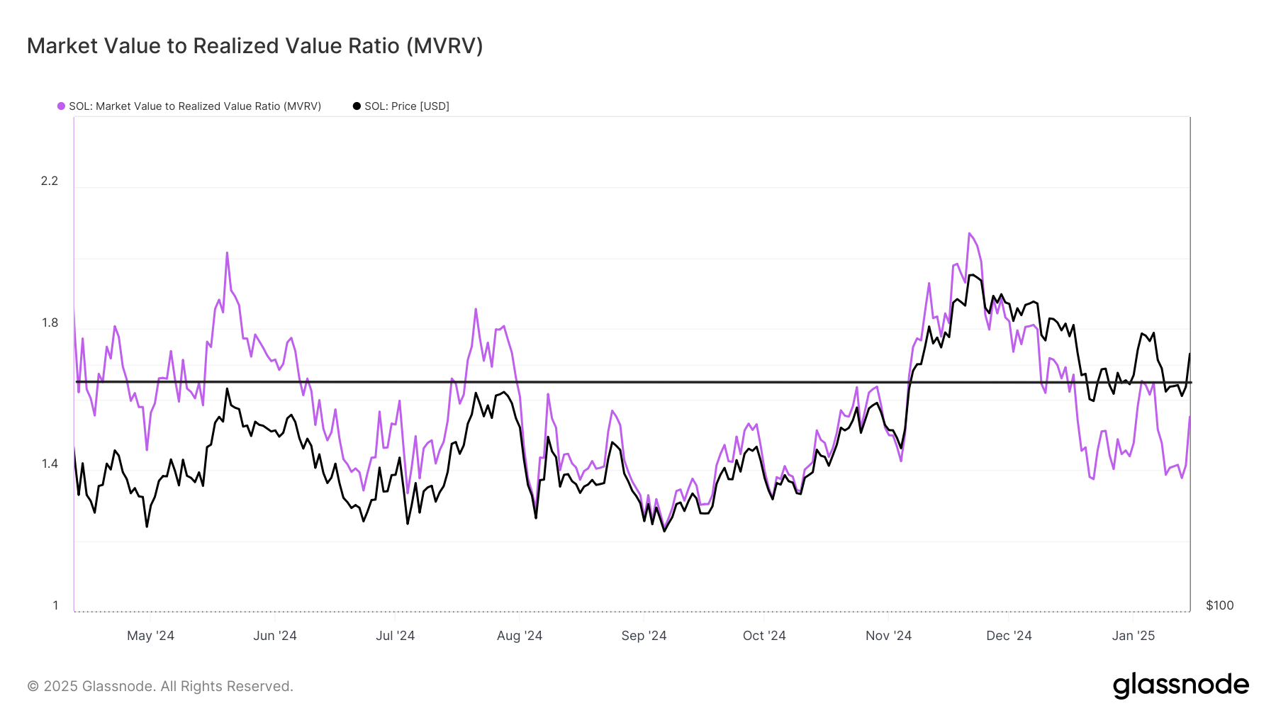 Коэффициент MVRV (соотношение рыночной и реализованной стоимости) для SOL резко растет, приближаясь к опасному порогу 1,65. Исторически, когда MVRV превышает этот уровень, это сигнализирует о повышенной активности фиксации прибыли, что часто приводит к развороту цены. В начале месяца подобный паттерн уже провоцировал спад.