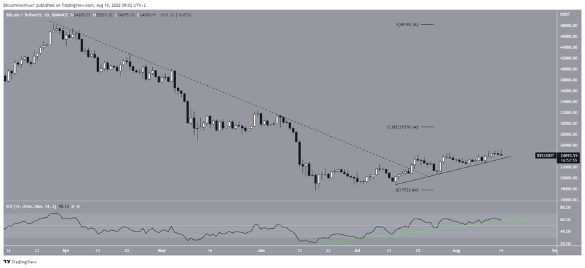 Биткоин отметил исторический максимум на $69 000 в ноябре 2021 года и с тех пор сдавал позиции. В июне 2022 года BTC сформировал минимум на $17 622 и начал укрепляться. В итоге 15 августа цена достигла максимума на $25 211.