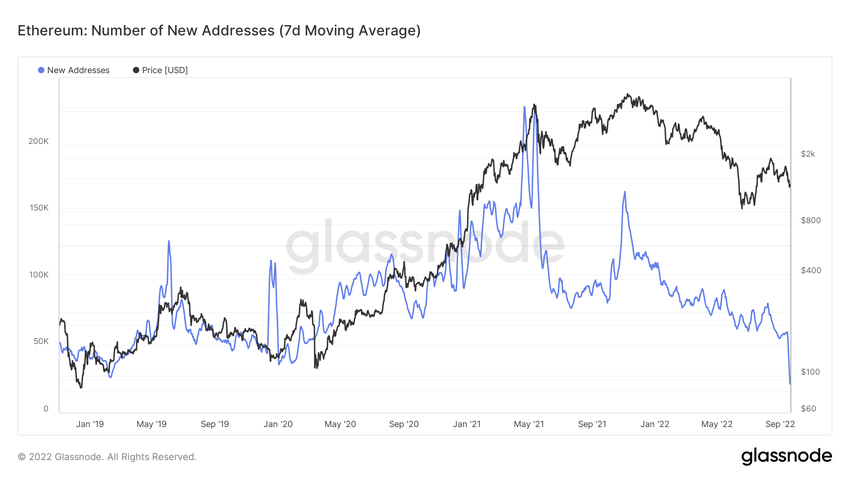 Того же нельзя сказать об Ethereum. Здесь число новых адресов устойчиво снижается с мая 2021 года. На данный момент показатель просел ниже уровней марта 2020 года. Агрессивные продажи прошлой недели дают основания предположить, что это могло быть связано с резонансным событием в экосистеме Ethereum, когда 15 сентября весь мейннет в рамках долгожданного обновления Merge переехал с крайне энергозатратного механизма Proof-of-Work (PoW) на алгоритм доказательства доли владения (Proof-of-Stake, PoS).