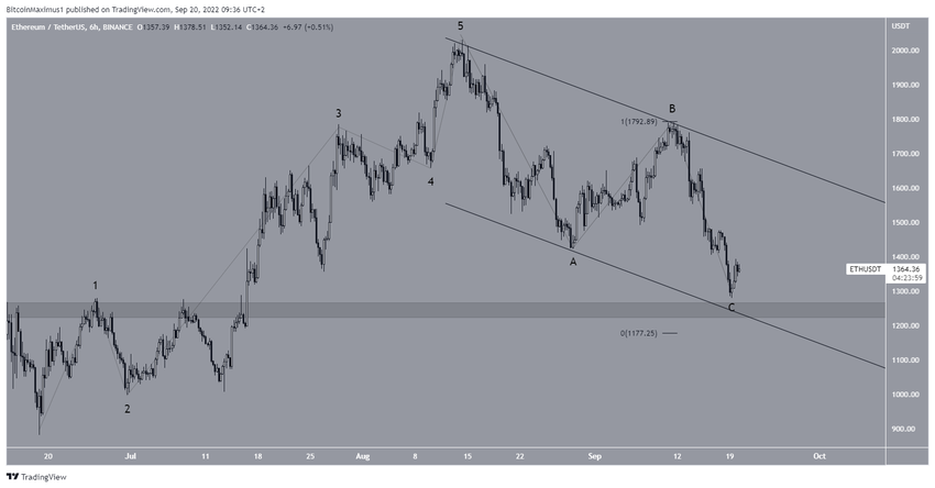 Впрочем, цена продолжает подавать бычьи сигналы. Хотя курс ETH снижается с 11 сентября, он приближается к области схождения поддержек в районе $1 200. Она представлена линией поддержки нисходящего параллельного канала, областью горизонтальной поддержки $1 250 и соотношением длины волн A:C как 1:1.