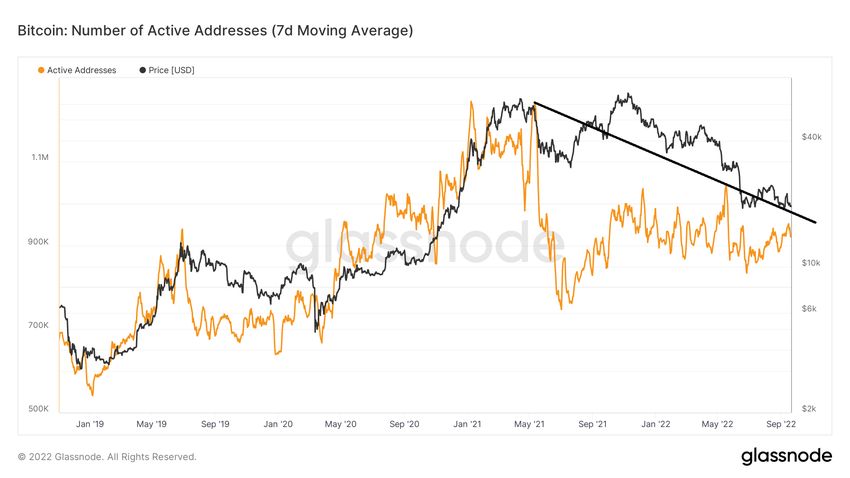 Впрочем, в течение последнего месяца число новых адресов увеличивается и приблизилось к линии нисходящего сопротивления этой дивергенции. Устойчивый рост индикатора может стать сигналом о завершении нисходящего тренда.