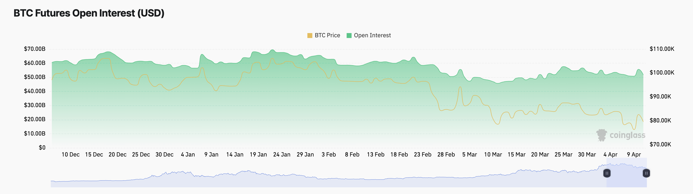 Открытый интерес по фьючерсам на BTC немного снизился на фоне общего падения рынка. На момент публикации он составляет $51,73 млрд, потеряв 7% за сутки. Это произошло на фоне снижения активности на крипторынке за последние 24 часа, в течение которых цена BTC упала на 2%.