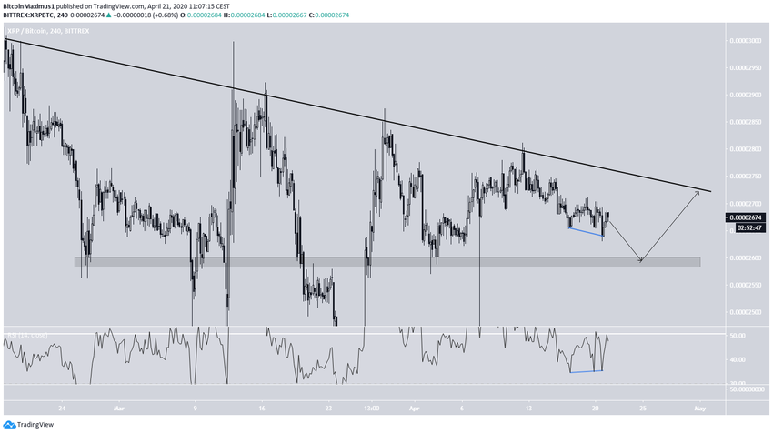 Курс XRP с 18 февраля снижается вдоль линии нисходящего сопротивления, уже пять раз проверив ее на прочность. На момент написания курс XRP торговался между этой линией и областью поддержки 2600 сатоши. Цена с 9 апреля не касалась ни одного из этих уровней.