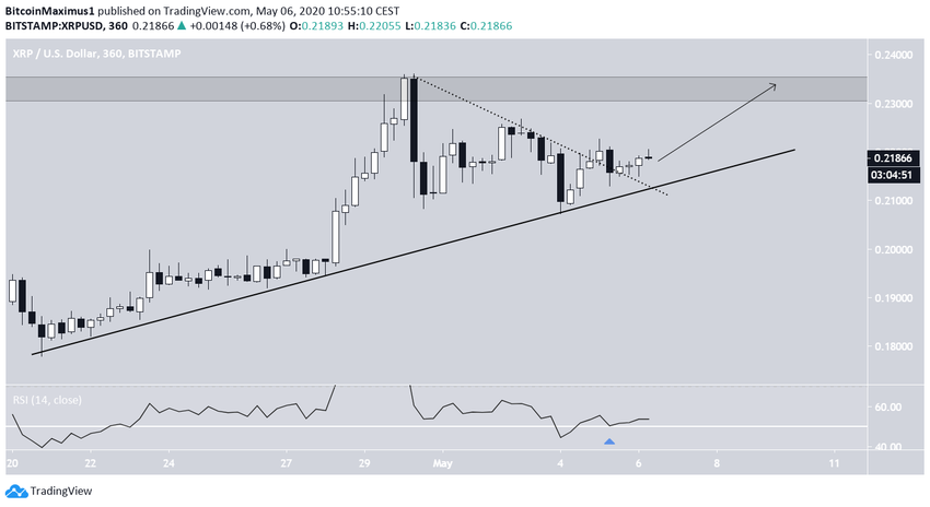 XRP нес потери с 30 апреля, совершая отскок от максимума $0.236. Максимум был достигнут в рамках важной зоны сопротивления, от которой котировки и оттолкнулись. Падение продолжалось до 3 мая, когда котировки достигли восходящей линии поддержки, за которой XRP следовал последние четыре дня. С тех пор токен немного подрос.