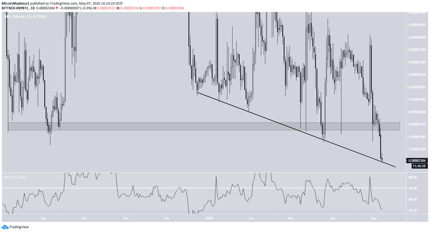 Курс XRP/BTC снизился к минимальному с декабря 2017 года уровню. При этом пара ушла под область поддержки 2450 сатоши, которая оставалась нетронутой с августа 2019 года. Теперь в будущем эта область может играть роль сопротивления.