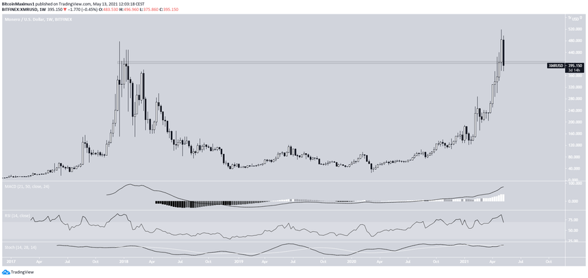 Курс XMR обновил 7 мая исторический максимум на $518.67. Сейчас цена находится в процессе формирования свечи медвежьего поглощения на недельном графике.