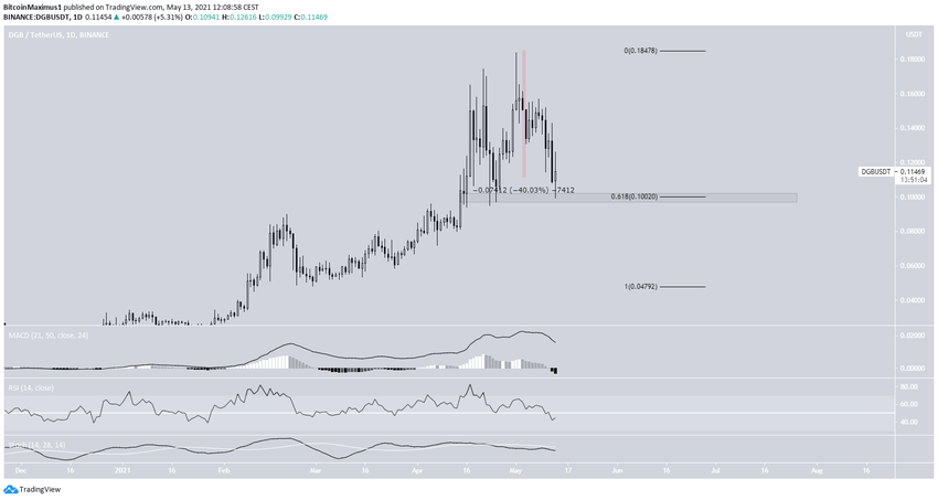DGB отметил 1 мая максимум на $0.184 и с тех пор начал снижаться. На данный момент цена потеряла 40% от своей стоимости.