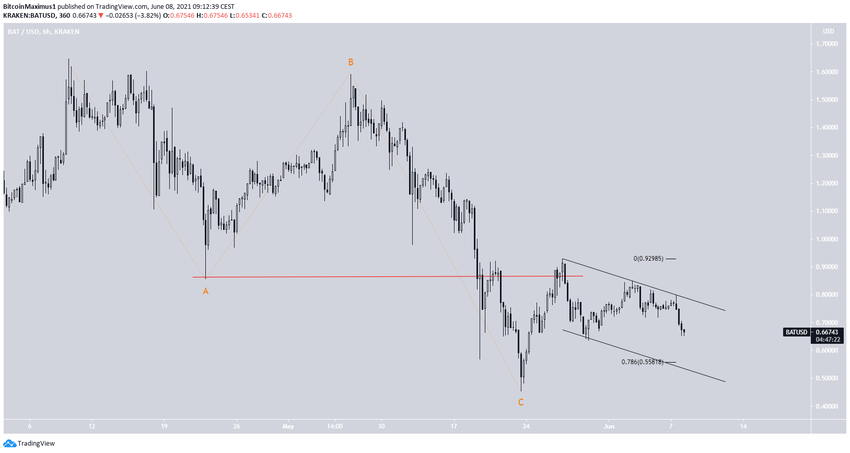 Курс коина BAT начал расти после отскока, совершенного 23 мая. Рост выглядит импульсным. Кроме того, перехлест выше предыдущего минимума $0.85 (красная линия) указывает на то, что предыдущее снижение было коррекционной структурой.