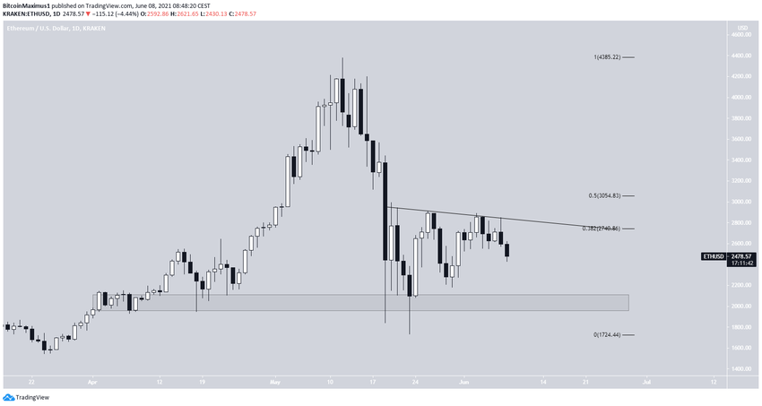 Курс коина блокчейн-сети Ethereum ETH совершил 23 мая отскок от области поддержки $2 050 и впоследствии достиг максимума на $2 910. Этот максимум был сформирован между уровнями Фибо 0.382-0.5 коррекции.
