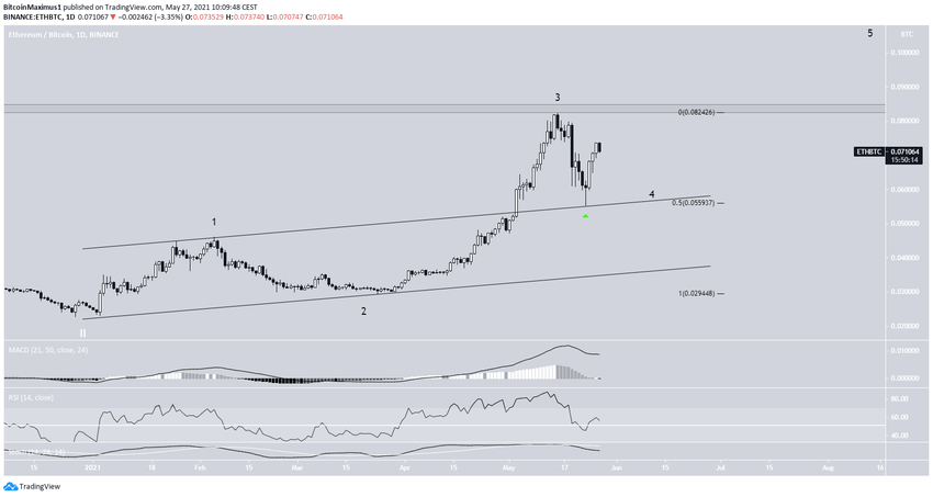 Курс Ethereum (ETH) 14 мая отскочил от области долгосрочного сопротивления ₿0.084 и начал снижаться. Просадка ETH/BTC продолжалась до 23 мая, и в итоге рынок сформировал минимум на ₿0.053.