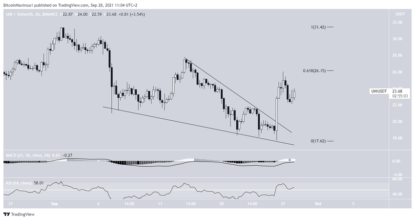 Курс коина UNI снижается со 2 сентября. После падения 7 сентября цена сформировала нисходящий клин, что в итоге привело к формированию 26 сентября минимума на $17.73.