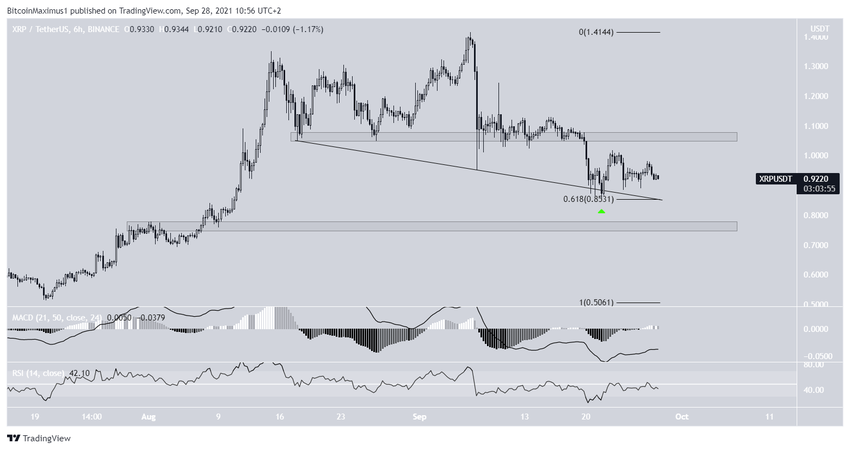 Коин проекта Ripple XRP с 17 августа движется вдоль линии нисходящей поддержки. Цена уже множество раз проверяла ее на прочность. В последний раз это произошло 21 сентября. Финальное касание линии поддержки (зеленый значок) совпало также с уровнем Фибо 0.618 на $0.85.