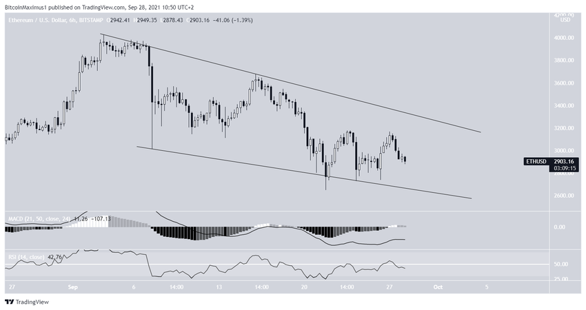 Определить линию поддержки представляется затруднительным из-за длинных нижних фитилей. Впрочем, возможно, что ETH торгуется внутри нисходящего клина.