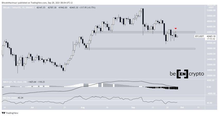 27 сентября биткоин (BTC) отскочил от области сопротивления $44 000 и сформировал длинный верхний фитиль (красный значок). Это является медвежьим сигналом, поскольку ранее эта область выступала в роли поддержки, теперь же отскок от нее утвердил ее в качестве сопротивления.