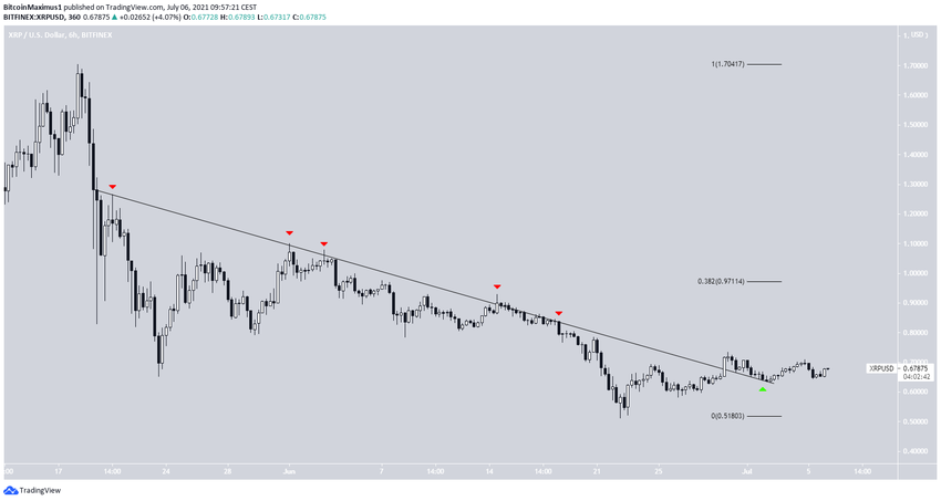 1 июля XRP вернулся и протестировал эту линию на прочность в качестве поддержки (зеленый значок). Впрочем, цене пока не удалось запустить существенный рост.